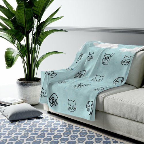Create a cozy warm atmosphere at home with this plush raining cats and dogs velveteen blanket. It is soft to touch and perfect for any home. With an all over print to add your personal touch or create a gift to your friends and family. Available in three sizes: 30×40″, 40×50″, 60×80″.